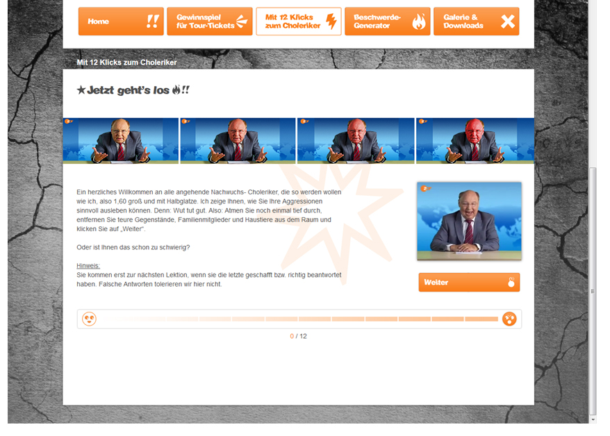 Hier kann sich der User in 12 blutdrucksteigernden Schritten zum Vollblut-Choleriker ausbilden lassen. Und das per E-Learning Kurs. Weiterhin findet der User unterhaltsame und buchstäblich aufregende Features auf der Seite: Beschwerdebrief-Generator, Download-Bereich etc.